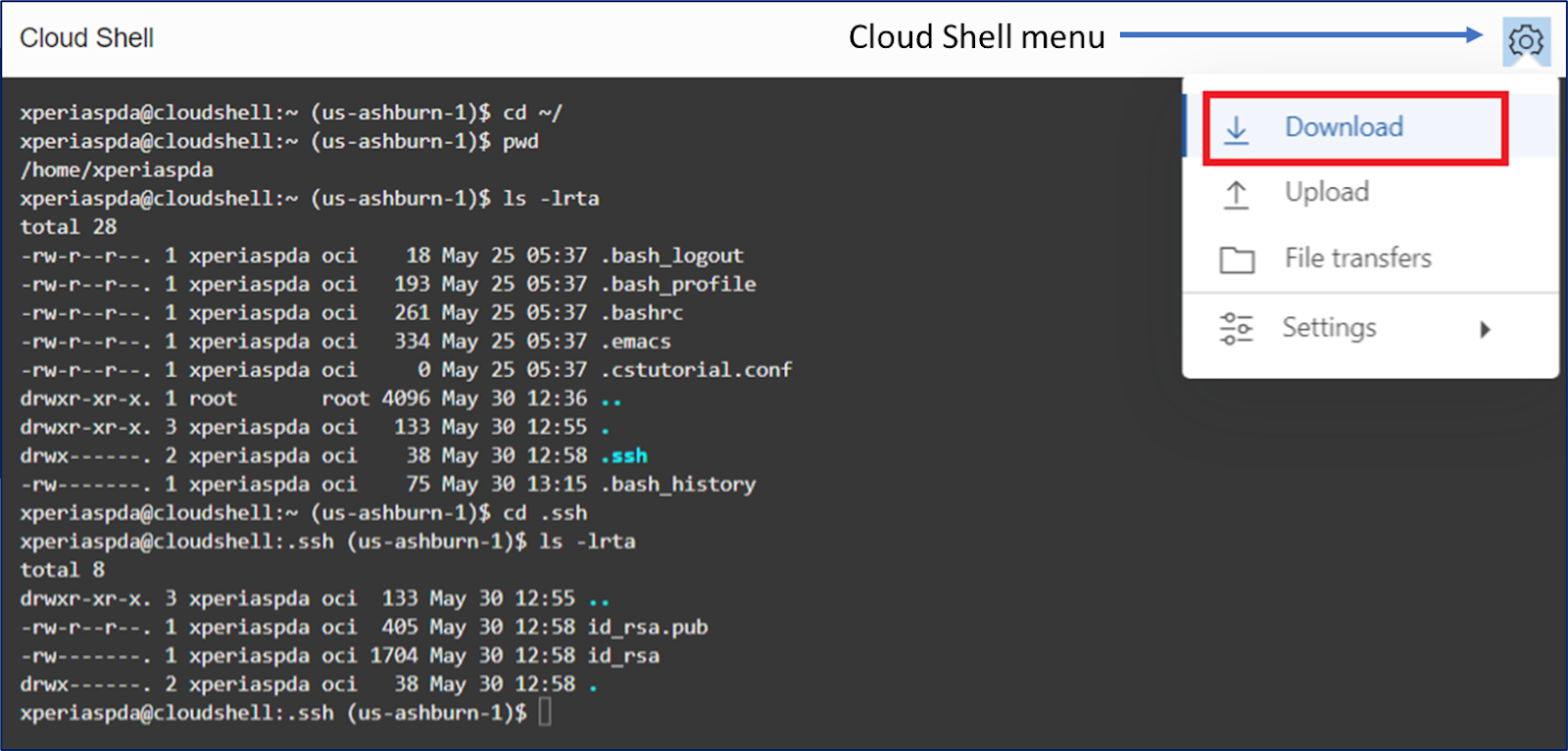- Now let's download these key files. Click Cloud Shell menu and select Download option