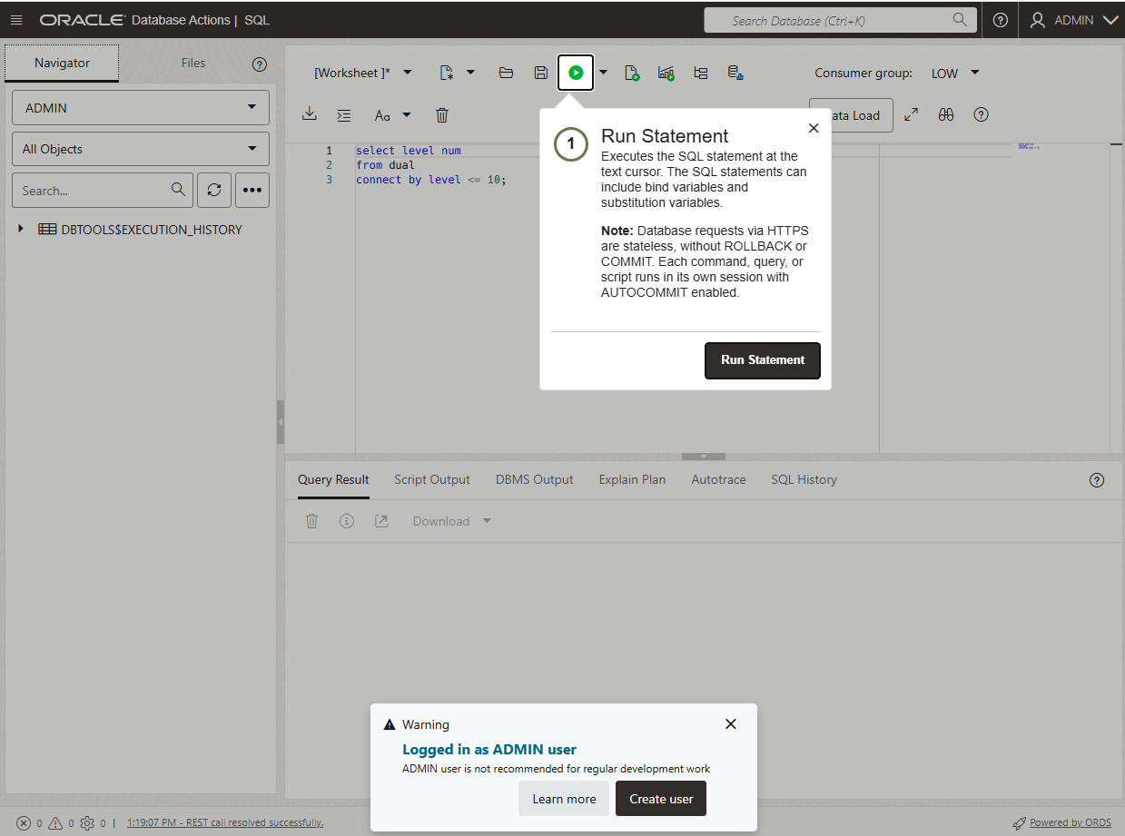 - Database Actions | SQL page will appear and logged in user will be ADMIN. Click on Run Statement button to run the displayed SQL query